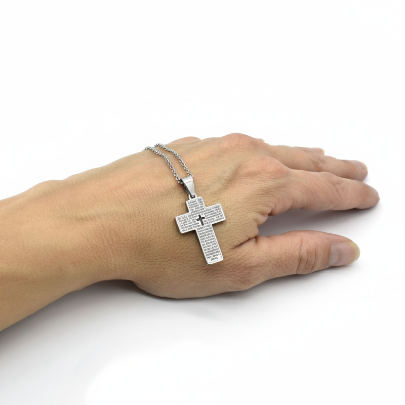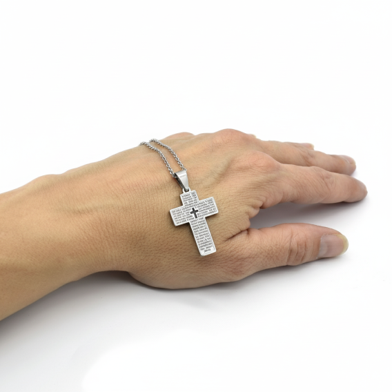Collar con colgante de medalla con cruz acero en plateado con grabado del Padre Nuestro