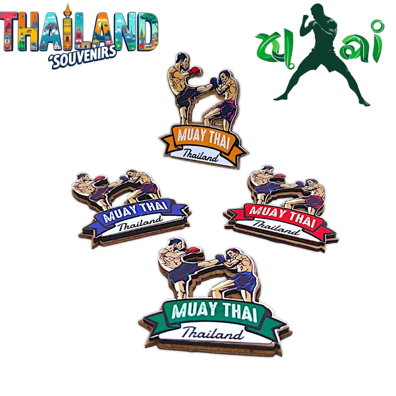 Cada imán está cuidadosamente tallado en madera y pintado en colores llamativos, mostrando la icónica postura de lucha de Muay Thai y la orgullosa inscripción "Thailand". No son baratijas producidas en masa; son piezas de arte únicas, imbuidas del espíritu de la artesanía tailandesa.
