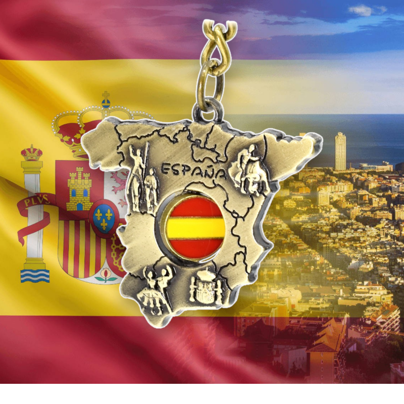 Llavero de anilla con la silueta de España con grabados de Don Quijote, sevillana y torero y con la bandera nacional en el centro.