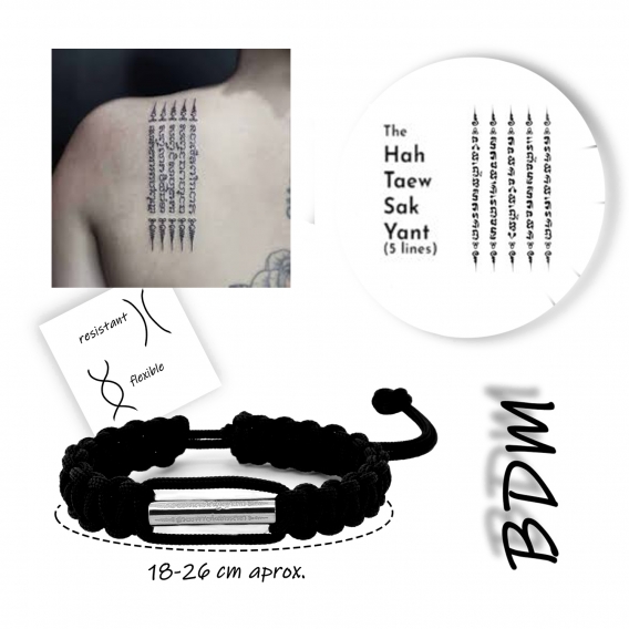 Lleva contigo la protección y las bendiciones del antiguo ritual Sak Yant Ha Taew. Esta pulsera única combina símbolos budistas y tibetanos en un diseño que representa fuerza, suerte y espiritualidad, inspirada en los tatuajes tradicionales y los yantras sagrados de Tailandia y Tibet.